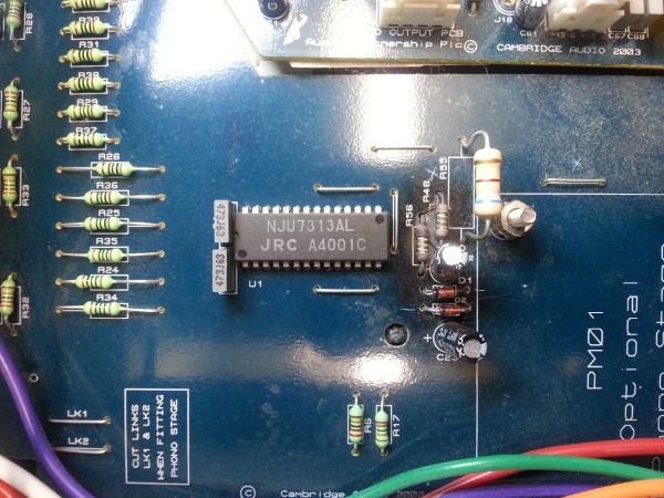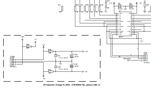 Im Bild sichtbar die Quellenwahl mit U1 IC NJU7313AL daneben die Widerstände R56 und R48 sowie die Zener Dioden D1 und 2. Genauer zu betrachten sind aber die Elkos C22 und C23. Ein Kapazitätsverlust hier führt zu einer Unsymetrie der Versorgungsspannung +12 V und -12 V.